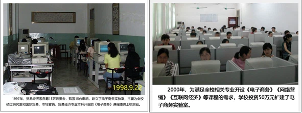 1997年,我校在全校硕士研究生中开设了《电子商务》。1998年,国际贸易、市场营销和贸易经济等专业将《电子商务》纳入本科全程培养方案,并陆续在这些专业开设《网络营销》《网络经济分析》《EDI在国际贸易中的应用》等专业课程。