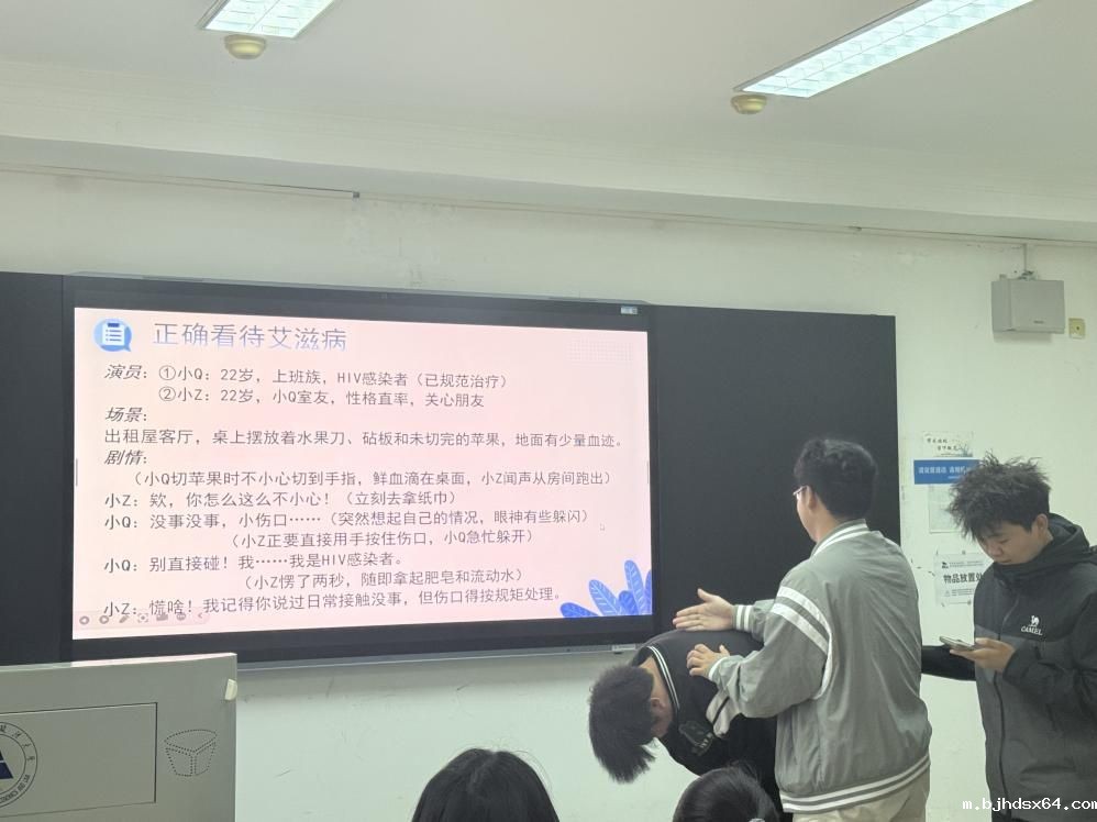 接着,同学们围绕“艾滋病之于性教育”、“艾滋病的检测与中招后的补救”以及“如何面对患艾滋病好友的血液暴露”三大主题,根据抽签方式选定剧本,进行情景剧的创作演绎。同时,主持人引导同学们积极讨论,在思想的交流与碰撞中,大家形成了科学的防艾态度,培养了解决具体问题的能力。