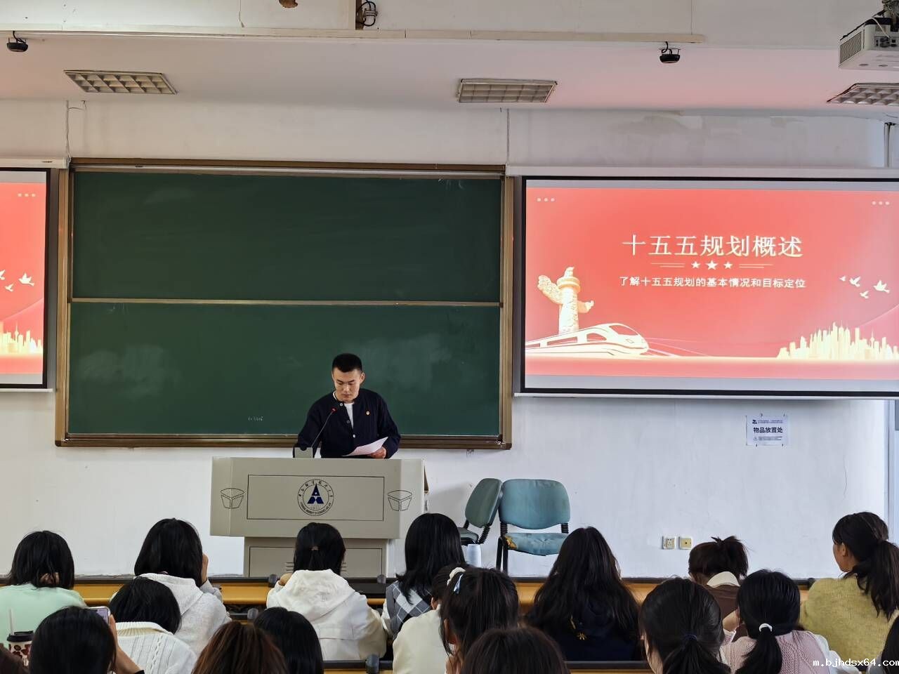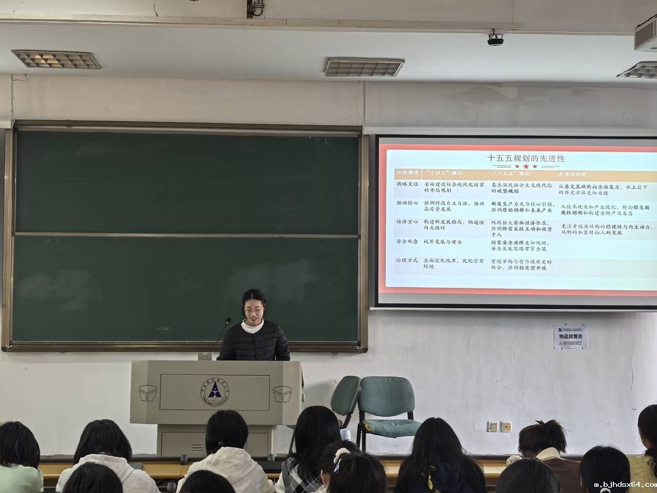 活动第二项,在“十五五”规划概述”环节,团支书赵伟扬同学围绕当前我国发展环境态势、“十五五”概念阐述、涵盖多方面的主要发展目标、长远发展意义等方面,带领在场同学了解“十五五”规划的基本情况与目标定位。此环节将“国之大者”具象化,使同学们对国家未来发展方向、战略重点和任务举措有了系统性、框架性的认识,明晰了国家前进的脉搏与步调。