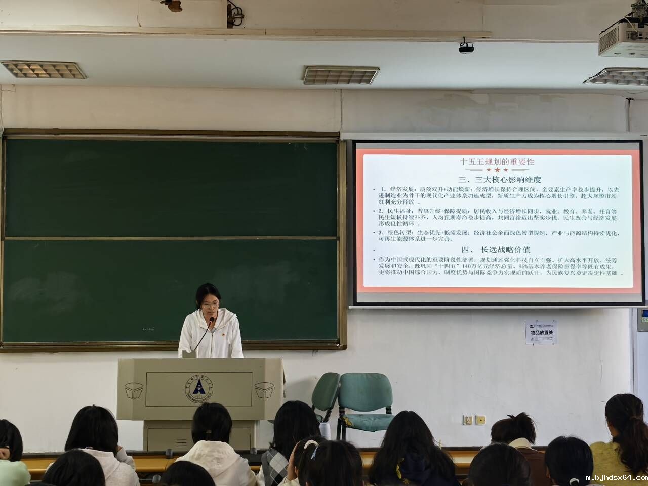 活动第三项,在“十五五”规划的重要性”环节,学习委员周怡彤同学通过向大家介绍“十五五”规划的特征、历史意义、三大核心影响维度以及长远战略价值,带领在场同学深度解读“十五五”规划对于国家发展的重大意义。