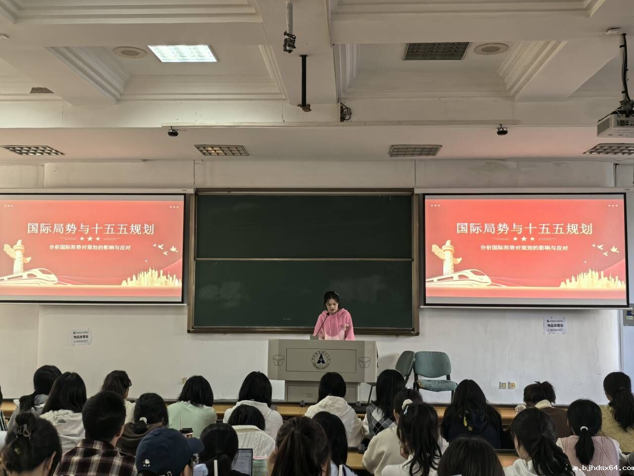 活动第五项,在“国际局势与“十五五”规划”环节中,心理委员张雨萱同学系统梳理科技、经济、气候等国际局势要素与“十五五”规划的多层次联系,带领在场同学分析国际形势对规划的影响与应对,引导同学们将目光投向波澜壮阔的全球图景。