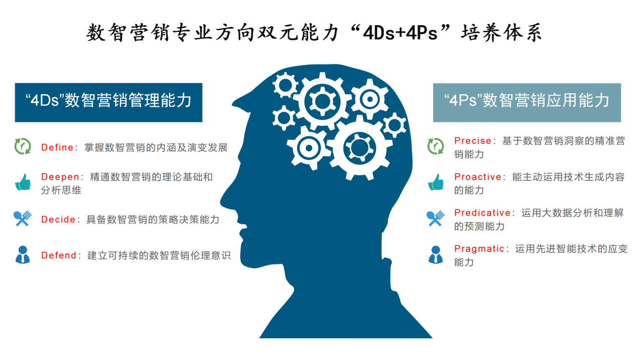 培养目标专注数智营销双元能力的建立和提升,包括“4Ds”数智营销管理能力和 “4Ps”数智营销应用能力两个方面(具体见图1)。